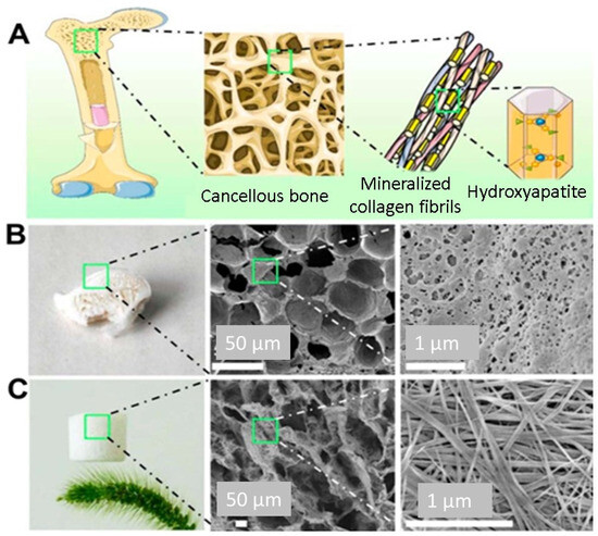 (A) Schematic illustration of the microstructure of the cancellous bone. (B) Digital image and SEM micrographs of the cancellous bone. (C) Digital image and SEM micrographs of the as-prepared HAP nanowire aerogel. Reprinted with permission from [Yong-Gang Zhang], [Bioinspired Ultralight Inorganic Aerogel for Highly Efficient Air Filtration and Oil–Water Separation]; published by ACS (2018) [137].