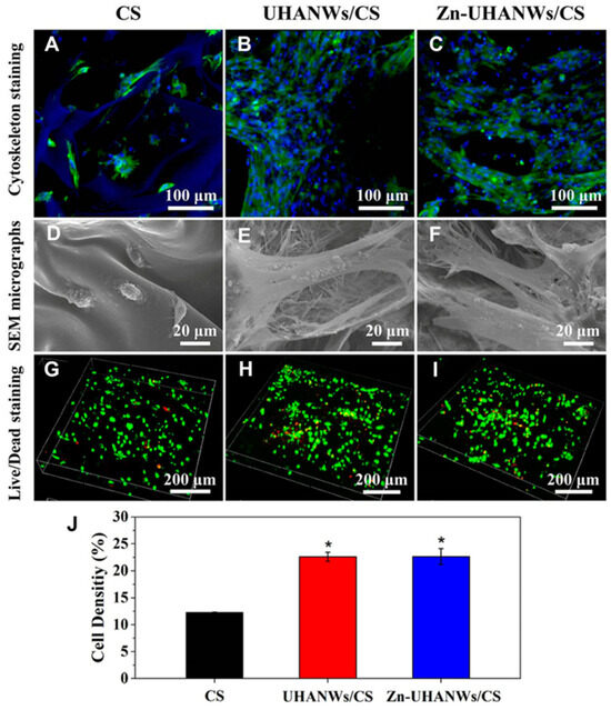 Cell adhesion and growth on the porous scaffolds. (A–C) Staining of the cytoskeleton and (D–F) SEM images of rBMSCs on the scaffolds after 3 days of culture: (A,D) CS, (B,E) UHANWs/CS, and (C,F) Zn-UHANWs/CS; (G–I) staining of dead/alive cells (red staining for dead cells and green staining for live cells) of rBMSCs on the scaffolds after 7 days of culture: (G) CS, (H) UHANWs/CS, and (I) Zn-UHANWs/CS; (J) the density of live cells (defined as the green area/total area × 100%) on the porous scaffolds of CS, UHANWs/CS, and Zn-UHANWs/CS. * p < 0.05 compared with the CS scaffold group. Reprinted with permission from [Tuan-Wei Sun], [Porous nanocomposite comprising ultralong hydroxyapatite nanowires decorated with zinc containing nanoparticles and chitosan: synthesis and application in bone defect repair], published by Wiley (2018) [139].