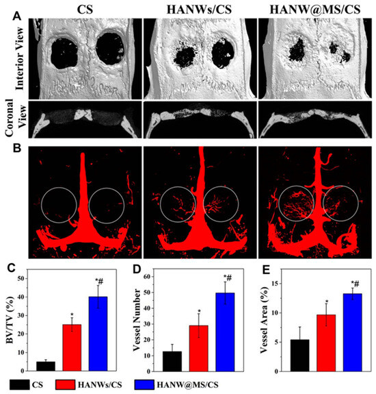 Micro-CT assessment of newly formed bone and blood vessels in rat calvarial defect regions after the implantation of scaffolds of CS, HANWs/CS, and HANW@MS/ CS for 12 weeks. (A) Three-dimensional (3D) and coronal views of reconstructed calvarial images. (B) Newly formed blood vessels presented by 3D reconstructed images. Morphometric analysis was completed for the percentage of newly formed bone volume (BV/TV) (C), blood vessel number (D), and blood vessel area (E) in the defects. * p < 0.05 compared to CS scaffold; # p < 0.05 compared to HANWs/CS scaffold. Reprinted with permission from [Tuan-Wei Sun], [Hydroxyapatite nanowire@magnesium silicate core-shell hierarchical nanocomposite: synthesis and application in bone regeneration]; published by ACS (2017) [142].