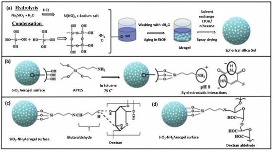 Visual depiction of the experimental procedure: (a) Creating spherical silica aerogels through the sol-gel technique, (b) modifying the silica aerogel surface with APTES and incorporating the 5-FU drug, (c) applying a dextran layer to the silica aerogel surface with GA crosslinker, and (d) covering the silica aerogel surface with dextran aldehyde. Reprinted with permission from [Ecem Tiryaki], [Novel organic/inorganic hybrid nanoparticles as enzyme-triggered drug delivery systems: Dextran and Dextran aldehyde coated silica aerogels]; published by Elsevier (2020) [151].