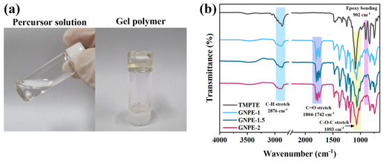 (a) Macroscopical comparison of electrolyte state before and after cationic ring-opening polymerization, (b) FT IR results of GNPEs compared with pure TMPTE.