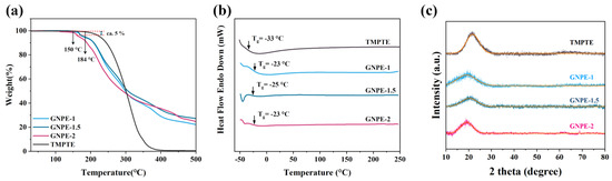 (a) TGA, (b) DSC result curves, and (c) XRD pattern of GNPEs and pure TMPTE.