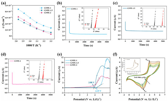 (a) Temperature dependent ionic conductivity of GNPEs, (b–d) chronoamperometry curves of the symmetrical cell Li/GNPEs/Li at a polarization voltage of 10 mV and Nyquist plots of the cell before and after polarization, (e) linear sweep voltammetry for the SS/GNPEs/Li foil between 0 and 6 V at a rate of 1 mV s−1, (f) cyclic voltammogram for the LiFePO4/GNPE-1/Li half−cell between −0.5 to 6 V at a rate of 0.1 mV s−1.