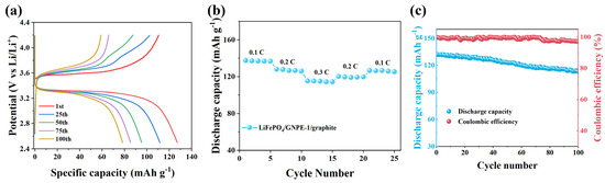 (a) Voltage profile of the LFP/ GNPE-1/graphite battery at selected cycles under 0.2 C, (b) rate performance of the LFP/GNPE-1/graphite battery, and (c) Coulombic efficiency and discharge capacity of the LFP/GNPE-1/graphite battery for 0.2 C after 100 cycles at RT.
