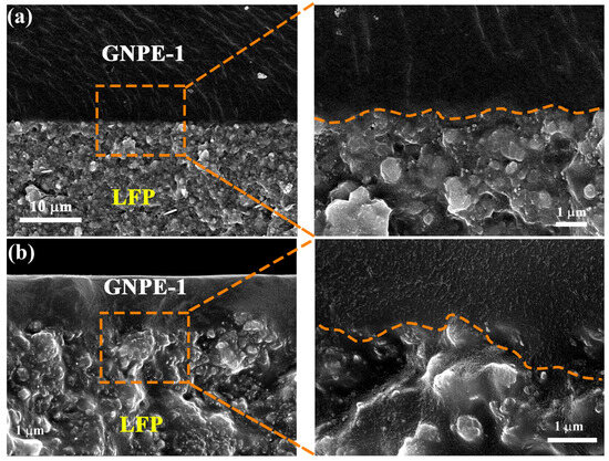 SEM images of a cross-section for GNPE-1 before (a) and after (b) 100 cycles on the LFP cathode.