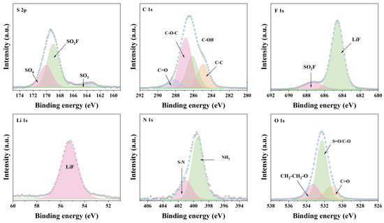 Furthermore, XPS was selected for the chemical surface composition investigation of the graphite anode after the cycling test. To the best of our knowledge, LiF was formed after LiFSI electrochemical reduction through S-F bond cleavage [60]. This result can explain the high amount of LiF in the SEI when an imide-based lithium salt is applied to the electrolyte [61]. In Figure 6, the LiF peaks in F 1s (684.5 eV) and Li 1s (55.2 eV) implied that the SEI layer formed on the graphite anode after the cell test [49]. The dominant peak at 687.29 eV in the F 1s spectra was attributed to the SO2F of LiFSI, which could also be found at the peak of 168.99 eV in the S 2p spectra [62,63]. Moreover, the S=O species located at 539.29 eV in the O1s spectra overlapped with the C-O species. Turning to the C 1s scan, the peaks from 284.83 to 289.78 eV were mainly assigned to the solvent of the EC/DEC and CH2-CH2-O chain after epoxy ring-opening polymerization. The corresponding peak of the CH2-CH2-O chain was also surveyed in the O 1s spectra at 531.59 eV according to a previous report [64,65]. Finally, the N 1s spectra exhibited two peaks at 400.93 and 399.44 eV corresponding to S-N and NH2 from the FSI− anion [66].
