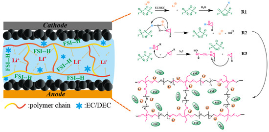 Illustration of in situ cationic ring-opening polymerization catalyzed by LiFSI and the eventual chemical structure of a gel network polymer electrolyte based on TMPTE.