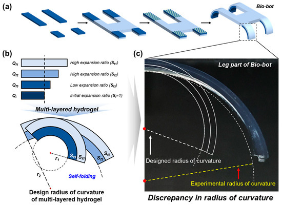 (a) Schematic description of the preparation of the biological machine (Bio-bot) by self-folding. (b) Schematic diagram illustrating the design of the radius of curvature for multi-layered hydrogels. The radius of curvature is predicted using the heat-induced bimetallic strip equation, with mechanical properties as the expansion ratio and elastic modulus of each layer. (c) Image depicting the radius of curvature of the multi-layered hydrogel, formed larger than the intended radius of curvature.