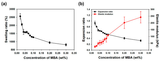 (a) The swelling ratio of the AAm hydrogels with varying MBA concentrations. (b) The expansion ratio and the elastic modulus of the AAm hydrogels at different MBA concentrations.