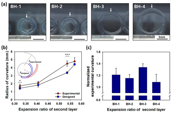 (a) Bright field images of bi-layered hydrogels with varying expansion ratios of the second layer. The abbreviations BH-1, BH-2, BH-3, and BH-4 correspond to different bi-layered hydrogel samples. (b) Calculated radius of curvature for the bi-layered hydrogel using a mathematical model developed for the curvature of a heat-induced bimetallic strip. Comparison of designed and experimental radius of curvatures based on differences in the expansion ratio of the two layers. (* p < 0.05, *** p < 0.01) (c) Normalized experimental curvature of BH-1, 2, 3, 4. Experimental curvatures for BH-1, 2, 3, 4 have been normalized to the designed radius of curvature.