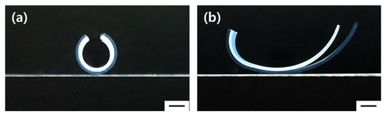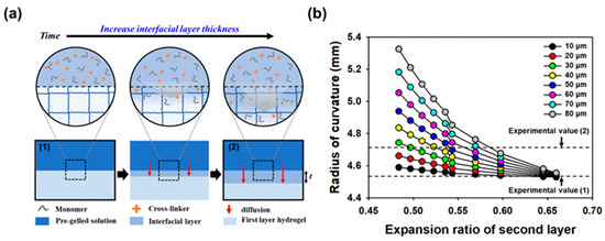 The radius of curvature (r) of multi-layered hydrogels was determined using the bimetallic strip curvature Equation (4) [9,12]. In Equation (4), E1 and E2 represent the elastic modulus of each layer, t1 and t2 represent the thickness of each layer, and ∆ε represents the difference of expansion ratio of each layer.