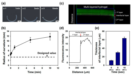 Notably, the experimental radius of curvature in the bi-layered hydrogel with 10 s of diffusion time measured 5.01 mm, indicating that the thickness of the interfacial layer had grown to more than 60 μm, as simulated. These findings underscore the importance of the rapid manufacturing of multi-layered hydrogels to align with the designed radius curvature. Furthermore, to verify the actual thickness of the interfacial layer, a bi-layered hydrogel was prepared by introducing 0.0005% (w/v) of Fluorescein O,O′-dimethacrylate (Sigma, St. Louis, MO, USA) into the second layer. Immediately after fabrication, an image was captured using a fluorescence microscope (Figure 5c), and the thickness of the interfacial layer and each layer was measured based on the fluorescence intensity and distance within the image (Figure 5d). Bi-layered hydrogels were prepared with diffusion times of 0 and 10 s for BH-3 and 0 s for BH-5. As a result, the thickness of the interfacial layer in BH-3 and BH-5 at 0 s was measured as 11.10 ± 0.82 μm and 29.87 ± 1.92 μm, respectively. Additionally, the thickness of the interfacial layer of BH-3 at 10 s was measured as 63.42 ± 2.91 μm (Figure 5e). These results underscore the importance of considering the interfacial layer in the design of multi-layered hydrogel curvatures, aligning with previous simulation findings. In light of our findings on the interfacial layer’s growth under varying diffusion times, we anticipate the need to precisely control the formation of interfacial layers and measure their properties for more accurate regulation.