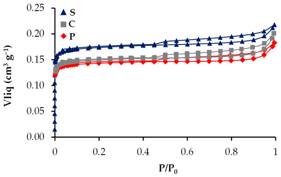 The N2 adsorption–desorption isotherms of the samples prepared by painting by brush (P), screen printing (S) and the conventional method (C) are shown in Figure 1. All samples show a mix of isotherms type I and IV with hysteresis loop type 4, which is typical for mesoporous materials [33]. The difference among the samples could be attributed to the dispersion type effected in each method; due to the printed screen, the ink is subjected to a pressure difference, which can result in a better dispersion of the particles. The surface area values and the volume of micro (W) and mesopores are shown in Table 1, where it is evident that there are no significant differences among the samples, although sample S shows all the highest values and C the lowest mesopore volume.