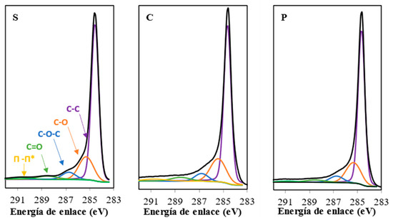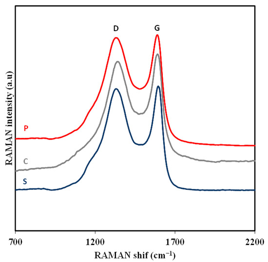 The Raman spectra of the samples P, C and S are shown in Figure 2 and were used to determine the degree of graphitization. All samples show the band associated to the vibrational modes of the graphite structure (G at 1590 cm−1) and the graphite structure defects (D 1340 cm−1) [34,35]. The intensity ratio ID/IG is used typically as an indicator of the defect density level [36]. The ratio ID/IG has values of 0.988, 0.976 and 0.982 for S, C and P, respectively, indicating that the samples have a good graphitization grade and that there is no significant difference among them.