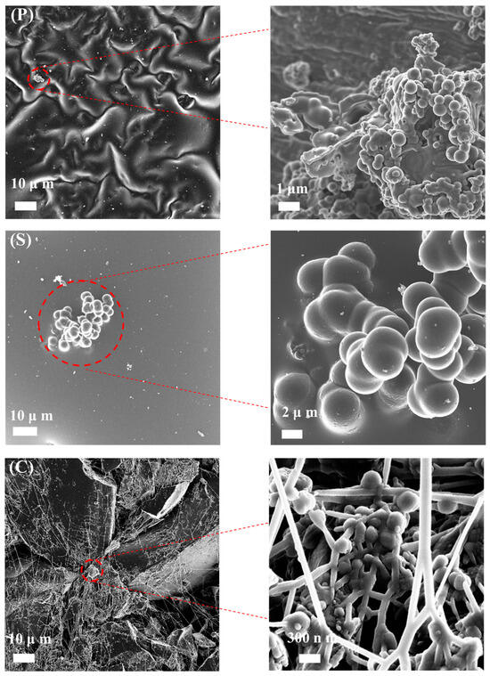 Sample S is the smoothest and shows fewer microspheres exposed on the surface; meanwhile, in the C sample, it is possible to observe the binder that generates a thread that traps the carbon spheres, generating more agglomerations.