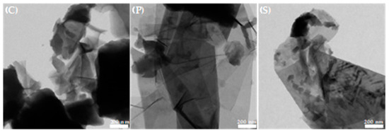The morphology of the samples was examined by TEM (Figure 5), where the OG structure can be observed with the typical texture (wrinkled sheets) and a good exfoliation of these [42,43]. At this level of magnification, all three samples look relatively similar.