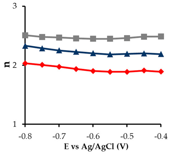 The cyclic voltametric (CV) experiments were carried out in N2 or O2 in a potential range of −0.75 V to −0.45 V, with a scan speed of 5 mVs−1 and 50 mVs−1. The linear sweep voltammetry (LSV) was carried out in O2 at different rotation speeds (500, 1000, 1500, 2000, 2500, 3000 and 4000 rpm) with exploration speed of 5 mVs−1 in the same potential range of CV. In the two cases, the support electrolyte used was KOH (0.1 M). To calculate the number of transfer electrons, the data obtained from LSV experiments were adjusted to the Koutecky–Levich model (Equation (1)) [62].
