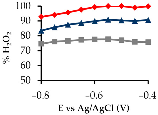 Figure 8 shows the electrogeneration of H2O2 at each potential for the samples S, C and P. For all samples, the H2O2 production is constant in all potential ranges, indicating that there are no changes of selectivity, maintaining a good stability at each potential. From these results, it is considered that the H2O2 production is heavily dependent on a good balance between the textural and electrochemical characteristic; the lowest Jk and mesopore volume of sample C could justify its penalty in the H2O2 generation sequence.