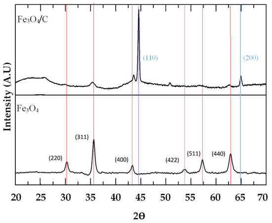 The peak (311) was used to determine the crystallite size by Scherrer´s equation, giving a mean diameter of 12.9 nm as the result. The sample Fe3O4/C shows the peaks associated to the crystalline planes (110) and (200) of zero-valent iron (or pure Fe phase); the other peaks can easily be mistaken with magnetite peaks in small intensity [52,53]. These results indicate that the carbonization to 900 °C principally occasioned the magnetite passing to zero-valent iron.