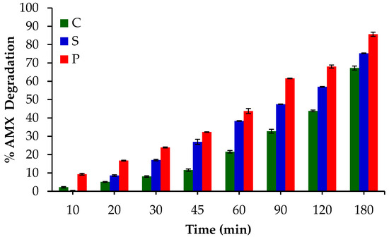 Finally, Figure 13 shows the deposition method effect in the degradation of AMX by EF. Over the entire reaction time range, sample P shows the highest percentage of AMX degradation, with samples P and S being better for this application than sample C, which shows the success of these new methods of preparation or deposition of electrocatalysts.