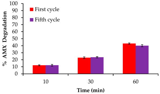 Finally, a minimum study of reusability was carried out with sample P, as this is a critical factor to determine a possible broader application. Therefore, the same prepared electrode was tested in the optimal EF conditions by five consecutive cycles. Figure 14 shows the AMX degradation kinetic after the first and fifth cycle of use, maintaining the EF system at the same degradation capacity after 60 min.