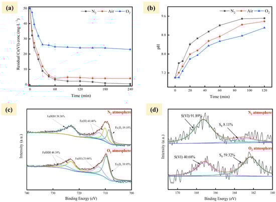 (a) Cr(VI) removal and (b) pH after reaction under different atmosphere, XPS spectra of Fe (c)/S (d) in reaction condition under different atmosphere.