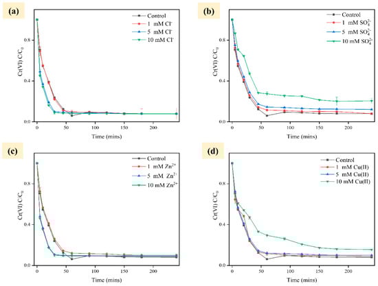 Elimination of Cr(VI) using PSA-nFeS under different ionic concentrations ((a) Cl−, (b) SO42−, (c) Zn2+, (d) Cu2+).