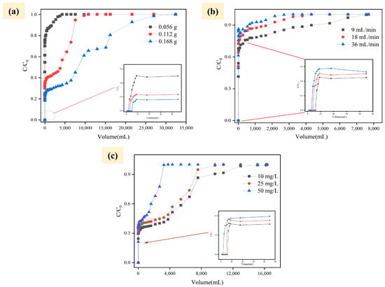 Figure 5c demonstrates that the experimental column penetrated at a concentration of 50 mg/L around 3800 mL of feed solution, with penetration effects of 25 mg/L and 10 mg/L for 10,000 mL and 15,000 mL of feed solution, respectively. The increased driving force at the interface between the sorbent–sorbate may be due to the increased concentration gradient due to the rise in Cr(VI) ions [35,36]. The experiment demonstrates that the expansion of the PSA-nFeS material due to liquid absorption increases its resistance to the Cr(VI) solution. The penetration curve increases with the initial concentration of Cr(VI) solution and the volume amount of the penetration point [37,38]. The lower the initial wastewater concentration, the better the contact reaction between PSA-nFeS and Cr(VI), leading to higher removal rates of Cr(VI). In practical applications, the lower the concentration of Cr(VI)-contaminated groundwater, the more effective the reaction is when passing through a filled column containing PSA-nFeS.