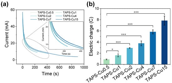 (a) Current–time curves and (b) different electric charges in the TAPS-CuX hydrogels (n = 3). * p < 0.05, *** p < 0.001.