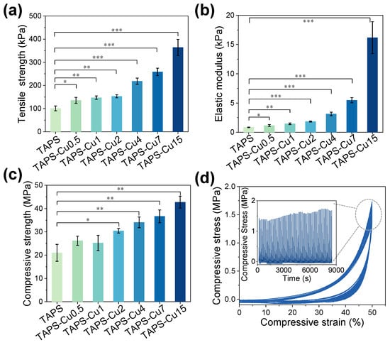 (a) Tensile strength and (b) tensile elastic modulus of TAPS hydrogels and TAPS-CuX hydrogels (n = 3). * p < 0.05, ** p < 0.01, *** p < 0.001. (c) Compressive strength of TAPS and TAPS-CuX hydrogels with the compression strain at 90% (n = 3). * p < 0.05, ** p < 0.01. (d) Compressive stress–strain curves and compressive stress time in 50% compression strain of TAPS-Cu15 hydrogel over 70 cycles.