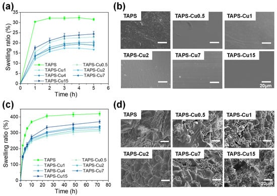 To evaluate the swelling property, the hydrogels were immersed in deionized water to reach the swelling equilibrium (Figure 3a). The swelling ratio of the TAPS hydrogels increased rapidly, ultimately reaching approximately 30% after 1 h. However, the swelling ratio of the TAPS-CuX hydrogels was lower than that of the TAPS hydrogels at 1 h and continued to increase and reached equilibrium after 4 h. The cross-section of the hydrogels after 24 h of swelling was observed using a scanning electron microscope (SEM, regulus 8230, Hitachi, Tokyo, Japan) []. The results show that the TAPS-CuX hydrogels exhibited a dense and smooth structure in the cross-section after swelling (Figure 3b). The hydroxyl groups of the TA molecules and the zwitterionic groups of the polySBMA chains in the TAPS hydrogels interact with the water molecules via hydrogen bonding and the solvation effect, causing swelling of the hydrogels. When the TA molecules were chelated with Cu ions, the hydrogen bonding between TA and water molecules was inhibited, resulting in a reduction in the swelling effect of the TAPS-CuX hydrogels.