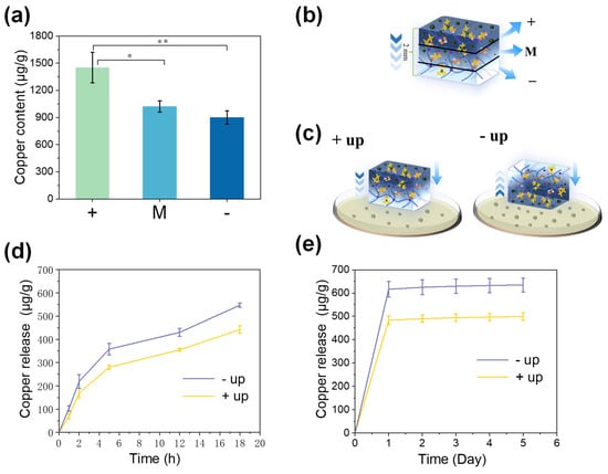 (a) Cu content in the + side, the middle part, and the − side of the TAPS-Cu15 hydrogel (n = 3). * p < 0.05, ** p < 0.01. (b) Schematic illustration of the positions of the + side, the middle part and the − side on the TAPS-Cu15 hydrogel. The thickness of the TAPS-Cu15 hydrogel is 2 mm. (c) Schematic illustration of the + side and the − side of the TAPS-Cu15 hydrogel contacting the agar gel in the copper release test. (d) Copper release from the + side and the − side of the TAPS-Cu15 hydrogel for 18 h (n = 3). (e) Copper release from the + side and the − side of the TAPS-Cu15 hydrogel for 5 days (n = 3).