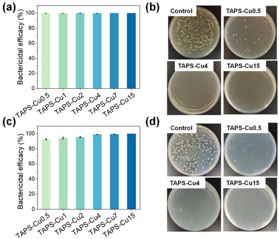 Bactericidal efficacy of TAPS-CuX hydrogels against (a,b) S. aureus and (c,d) E. coli after 6 h of incubation in PBS (n = 3). Digital photographs of the surviving (b) S. aureus and (d) E. coli clones in culture plates after 6 h of incubation with TAPS-CuX hydrogel.