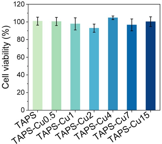 The cytotoxicity test of the hydrogels was performed following the ISO-10993-5 standard with minor modification []. As shown in Figure 6, the cell viability of all groups with hydrogel extracts was above 90%, indicating that the TAPS-CuX hydrogels had good biocompatibility. As reported in our previous study, TAPS hydrogels have good biocompatibility []. On the other hand, Cu is an essential trace element and serves as a bioactive component in vivo. Cu2+ has been reported to promote tube formation in vascular endothelial cells by activating the hypoxia-inducible factor 1 pathway [] and increasing the expression of angiogenesis-related genes, such as vascular endothelial growth factor []. Many studies have shown that Cu2+ can promote angiogenesis, cell migration, and collagen deposition and thus be effective in tissue regeneration [], especially skin tissue regeneration. The good biocompatibility and bioactivity of TAPS and Cu indicate the application potential of the TAPS-CuX hydrogel as wound dressings in the biomedical field.