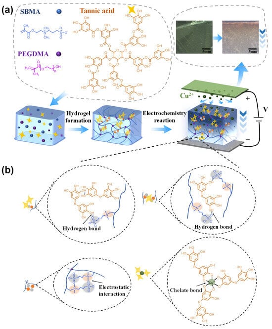 Previously, we obtained tannic acid (TA)-reinforced poly (sulfobetaine methacrylate) (polySBMA) hydrogels (TAPS). The TA molecules act as physical cross-linking agents in the polySBMA and as antioxidants and antibacterial agents, endowing them with biological activity []. In this study, gradient hydrogels with high mechanical properties, controlled release of antimicrobial agents, and enhanced antimicrobial properties were fabricated via a simple electrophoresis process of the TAPS hydrogels. The electrical field forced Cu ions to diffuse into the hydrogel matrix and formed a gradient cross-linked structure by chelating with the TA molecules and zwitterionic groups. The mechanical properties, antimicrobial properties, antimicrobial agent release profile, and cytotoxicity of the gradient hydrogels were studied to evaluate the application potential of the hydrogel as an antimicrobial wound dressing.