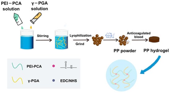 A 1 mL volume of PEI was diluted in 20 mL of deionized water and stirred evenly at room temperature. Then, 0.075 g of PCA was added to the above solution and stirred at room temperature for 4 h to obtain a solution. The reaction solution was dialyzed in deionized water for 3 days and lyophilized to obtain PEI-PCA powder. To prepare the PP hemostatic powder, PEI-PCA (1 wt.%, 4 mL, in distilled water) and γ-PGA (1 wt.%, 4 mL, in distilled water) solutions were mixed, and 16 mL of deionized water was added thereinto. Then, the mixed solution was placed in a freeze dryer for 72 h for lyophilization. Finally, 0.04 g EDC and 0.04 g NHS were added thereinto and grinded using a grinder for 5 min to obtain PP hemostatic powder. The PP hemostatic powder was stored in a 4 °C refrigerator for later use.