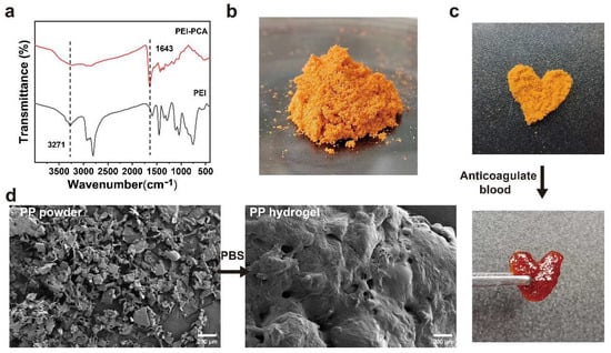 (a) Infrared spectra of PEI and PEI-PCA compounds; (b) macroscopic image of PP hemostatic powder; (c) macroscopic image of PP hemostatic powder absorbing anticoagulant blood to form a hydrogel; (d) SEM image of the PP hemostatic powder and PP hemostatic powder-derived hydrogel after absorbing PBS.