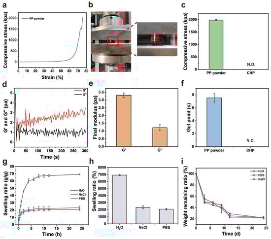 (a) Compressive stress–strain curve of the PP hemostatic powder-derived hydrogel; (b) schematic diagram of the compression experiment with the PP hemostatic powder-derived hydrogel; (c) final compressive strength of the PP hemostatic powder-derived hydrogel and CHP (N.D. = not detectable); (d) dynamic change diagram of G′ and G″ after adding PBS to the PP hemostatic powder; (e) final G′ and G″ after adding PBS to the PP hemostatic powder; (f) gelling time of the PP hemostatic powder and CHP N.D. = not detectable); (g) swelling kinetics curve of PP hemostatic powder-derived hydrogel in H2O, PBS, and NaCl solutions for 24 h; (h) swelling ratio of PP hemostatic powder-derived hydrogel in H2O, PBS, and NaCl solutions for 24 h; (i) degradation kinetics curve of PP hemostatic powder-derived hydrogel in H2O, PBS, and NaCl solutions for 24 h.