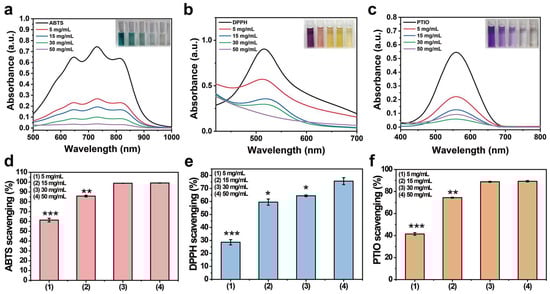 (a) UV–visible spectrum of ABTS· after being scavenged by PP hemostatic powder at different concentrations for 3 min; (b) UV–visible spectrum of DPPH· after being cleaned by PP hemostatic powder at different concentrations for 30 min; (c) PTIO· UV–visible spectrum after being cleaned by PP hemostatic powder at different concentrations for 2 h; (d) the clearance rate of ABTS· by PP hemostatic powder at different concentrations; (e) the clearance rate of DPPH· by PP hemostatic powder at different concentrations; (f) the scavenging rate of PTIO· by PP hemostatic powder at different concentrations. p * < 0.05, p ** < 0.01, p *** < 0.001.