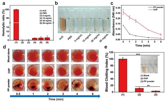 (a) Hemolysis ratios of PBS, H2O, and PP hemostatic powder at different concentrations; (b) photos of centrifuged blood cells treated with PBS, H2O, and PP hemostatic powder at different concentrations; (c) in vitro whole-blood coagulation kinetics curves of commercial CHP and PP hemostatic powders; (d) images of blood coagulation after different treatments; (e) blood coagulation index of full blood and blood treated with commercial CHP and PP hemostatic powders. p ** < 0.01, p *** < 0.001.