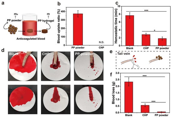 (a) Schematic diagram of measuring the blood absorption ratio of the PP hemostatic powder (m and m0 are the weight of the PP hemostatic powder and the hemostatic powder-derived hydrogel); (b) blood uptake ratio of PP hemostatic powder and CHP (N.D. = not detected); (c) tail-vein bleeding time of SD rats in the blank group, CHP group, and PP hemostatic powder group; (d) corresponding to (c) photo of tail-vein hemostasis; (e) schematic diagram of tail-vein hemostasis with PP hemostatic powder; (f) tail-vein blood loss of SD rats in the blank group, CHP group, and PP hemostatic powder group. p * < 0.05, p *** < 0.001.