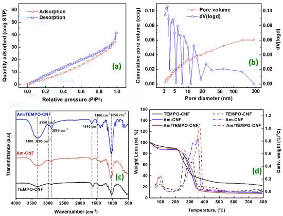 (a) Am/TEMPO-CNF nitrogen adsorption–desorption isotherm, (b) Am/TEMPO-CNF pore size distribution, (c) FTIR spectra of TEMPO-CNF, Am-CNF, and Am/TEMPO-CNF, and (d) TGA-DTG thermograph of TEMPO-CNF, Am-CNF, and Am/TEMPO-CNF.