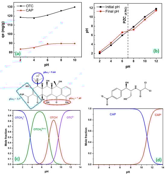 (a) Effect of pH on the adsorption capacity, (b) point of zero charge (PZC), (c) OTC structure with pH-dependent speciation curve, and (d) CAP structure with pH-dependent speciation curve.