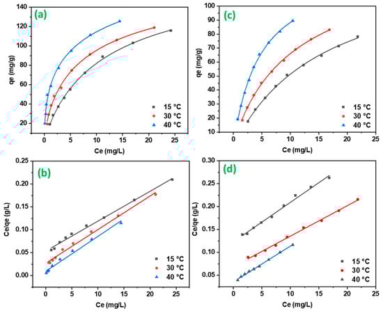 The adsorption isotherm curves of OTC and CAP using Am/TEMPO-CNF at different temperatures: (a) OTC Langmuir non-linear fit, (b) OTC Langmuir linear fit, (c) CAP Langmuir non-linear fit, and (d) CAP Langmuir linear fit.