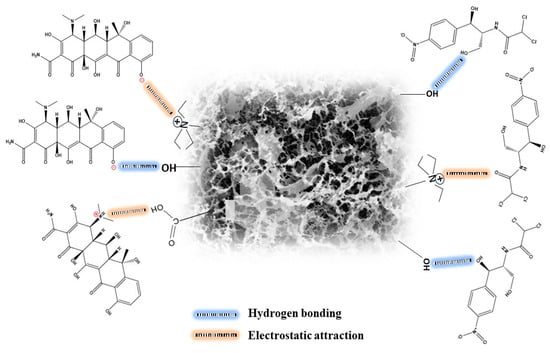 The results of our study indicate that the adsorption process of both antibiotics by Am/TEMPO-CNF involves mainly hydrogen bonding and electrostatic attraction (Figure 6). Hydrogen bonding could occur between the carboxyl and hydroxyl group of Am/TEMPO-CNF and the hydroxyl group and amide group of CAP [48]. The observed high adsorption capacity of CAP and OTC may be attributed to the occurrence of electrostatic interactions with the anionic sites of CAP and the phenolic diketone moiety anion of OTC, which possess a negative charge. The hydrogen bonding between -OH and -COOH groups in the adsorbent and -OH amide groups and tertiary amine (-N-(CH3)2) groups in the OTC is involved in the removal of OTC [5].