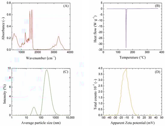 (A) FT-IR spectra, (B) DSC thermogram, (C) DLS size distribution, and (D) Zeta potential of extracted silk fibroin solution.