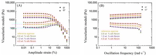 The results of the frequency sweep measurements confirmed the solid-like behavior of all samples, i.e., the independence or very weak dependence of the moduli on frequency []. The effect of silk fibroin on moduli values was identical to its effect on moduli in the LVER.