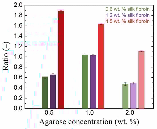 Changes due to the addition of fibroin to agarose hydrogels also occur at the cross-over points, i.e., changes in the corresponding common value of the moduli and in the value of the strain (Table S1 in Supplementary Materials). It should be noted that although cross-over occurs beyond the LVER, i.e., in a region of certain destructive changes, the cross-over points were reproducible in replicated amplitude sweep measurements. For pure agarose, the cross-over moduli value increased, and the strain decreased with increasing agarose concentrations. The smallest effect of fibroin addition was observed for the medium agarose concentration (1.0 wt. %). For the other two concentrations, the addition of fibroin at 0.6 and 1.2 wt. % decreased the cross-over moduli value and increased the corresponding strain, while at the highest concentration (4.5 wt. %), the moduli increased and the strain remained more or less unchanged.