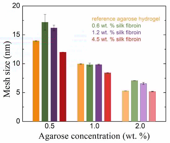 The addition of fibroin to agarose hydrogels also changed the mesh sizes in the hydrogel networks (Figure 4). Again, the samples had an agarose concentration of 1.0 wt. % behaved differently from the other two concentrations (cf., for example, Figure 3 and Figure 4). In the latter, with the addition of fibroin at 0.6 and 1.2 wt. %, the mesh size increased (relative to pure agarose), which was the result of the presence of fibroin inside the forming agarose network, hindering the physical crosslinking of the agarose chains. In the case of fibroin at the highest concentration (4.5 wt. %), the mesh size was smaller (0.5 wt. % agarose) or comparable (2.0 wt. % agarose) to that of pure agarose. The decreased mesh size indicates the filling of the original agarose network with fibroin fibers and/or the incorporation of fibroin into the agarose network. A decreased mesh size was also observed for increased agarose concentrations in our hydrogels.