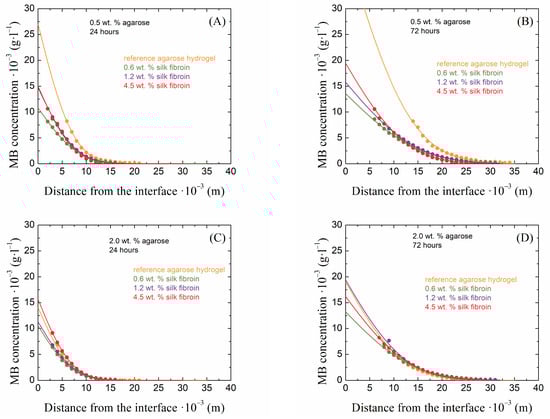 The method of diffusion from a constant source is used to observe the penetration of a diffusion medium through a porous hydrogel material. How the presence of fibrous fibroin structures affects the transport properties of agarose hydrogels can be well described using this macroscopic observation. The principle of this continuous diffusion method is the spectrophotometric monitoring of the absorbance intensity of the diffusing dye, which permeates the hydrogel sample prepared in a cuvette after the sample is placed in a container with a solution of this dye for a certain time. Examples of the obtained concentration profiles of methylene blue are shown in Figure 5 for the lowest and highest concentrations of agarose and with silk fibroin additions after 24 and 72 h of diffusion.